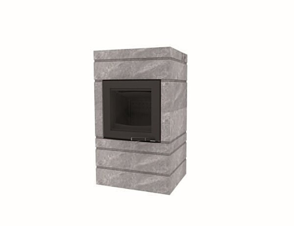 Moderní hranatá akumulační kamna s hmotností 767 kg, dobou sálání 10 hodin a možností volby designu dvířek.